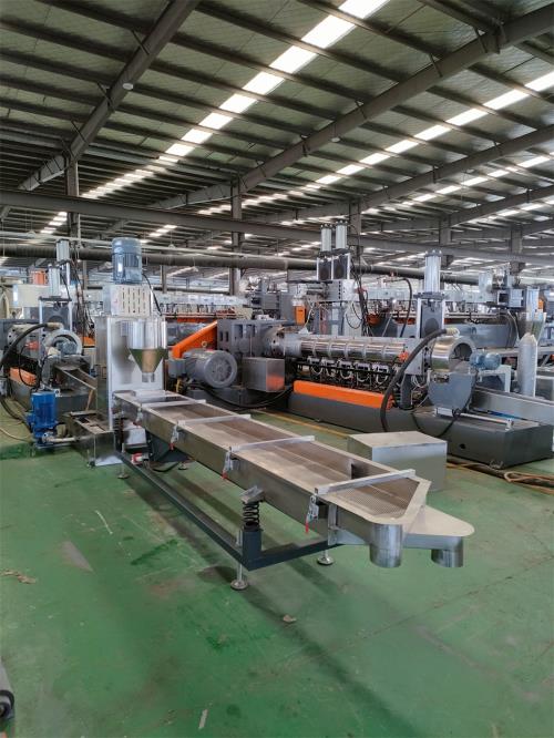 三晶或羅賓漢頻調(diào)速器4、螺桿1)直徑:φ250mm;長徑比:12:1;材質(zhì)為38CrMoALA氮化處理,氮化HV950-1050,深0.6-0.75mm,脆性不大于II級,螺桿外表鍍硬鉻處理;4) 螺桿芯部采用通水冷卻5、料筒1)材質(zhì)為38CrMoALA氮化處理,氮化HV950-1050,深0.6-0.75mm,脆性不大于II級;2)螺筒采用水冷卻;筒體上開槽,盤銅管,通冷卻油;螺筒上加防護罩,不銹鋼材質(zhì);3) 加熱區(qū)段:采用優(yōu)質(zhì)鑄鋁加熱器6、水冷卻系統(tǒng)1)水泵泵電機功率:3kw;自動控水電磁閥;手動閥用銅閘閥控制;加大水流量,2)采用環(huán)保風(fēng)冷卻系統(tǒng)(環(huán)保型:發(fā)明專利號:CN201911312134.6)不需要接外循環(huán)水冷卻,不用徘外水;采用閉環(huán)循環(huán)系統(tǒng)7.真空泵采用環(huán)保冷卻系統(tǒng)(環(huán)保型:發(fā)明專利號:CN201911312115.3)不需要接外循環(huán)水冷卻,不用徘外水;采用閉環(huán)循環(huán)系統(tǒng),真空泵功率:3kw8、300型液壓單板式自動換網(wǎng)系統(tǒng):管道料造粒代加工1)換網(wǎng)器,板式過濾自動換網(wǎng)器,流量截面為圓形;2)液壓缸、液壓站等一套,采用YA-N46抗磨46#液壓油;(油品需客戶自行采購)9、熱切機頭裝置:1) 熱電偶與壓力傳感器分開安裝,分別用于檢測溫度和壓力(五)水環(huán)模面熱切輔機系統(tǒng)1)水環(huán)模面熱切造粒機:2級電機,功率3kw;熱切刀一套、電機聯(lián)軸器一件,“三晶或羅賓漢”變頻調(diào)速器2)水環(huán)切粒罩:臥式,不銹鋼材質(zhì);一件;推拉式結(jié)構(gòu);帶剎車裝置;熱切罩與機頭分離開有足夠空間;操作方便;水環(huán)切粒罩與法郎為一體式;3)水泵一臺,功率11kw;加大型導(dǎo)流槽:不銹鋼材質(zhì),4)管道料造粒代加工離心脫水機:一臺,電機功率15kw,加大型水箱為優(yōu)質(zhì)不銹鋼材質(zhì);5)加長振動篩:一臺,L=4m,電機采用:震動專用電機;震動量可以調(diào)節(jié)大小:電機功率率:0.55KW兩臺;振動篩篩網(wǎng)采用三層分離物料;大孔直徑φ8mm,小孔直徑φ2.5mm,不銹鋼材質(zhì),振動篩出廠時;振動量調(diào)節(jié)到最??;6)風(fēng)吹料倉:一套,1m料倉一件,不銹鋼材質(zhì);采用φ130mm不銹鋼管聯(lián)接;4kw物料輸送風(fēng)機。